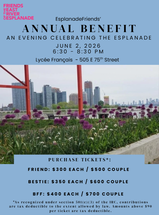 *As recognized under section 501(c)(3) of the Internal Revenue Code. Contributions to Friends of The East River Esplanade, Inc. are tax deductible to the extent allowed by law. Amounts above $90 per ticket are tax deductible.